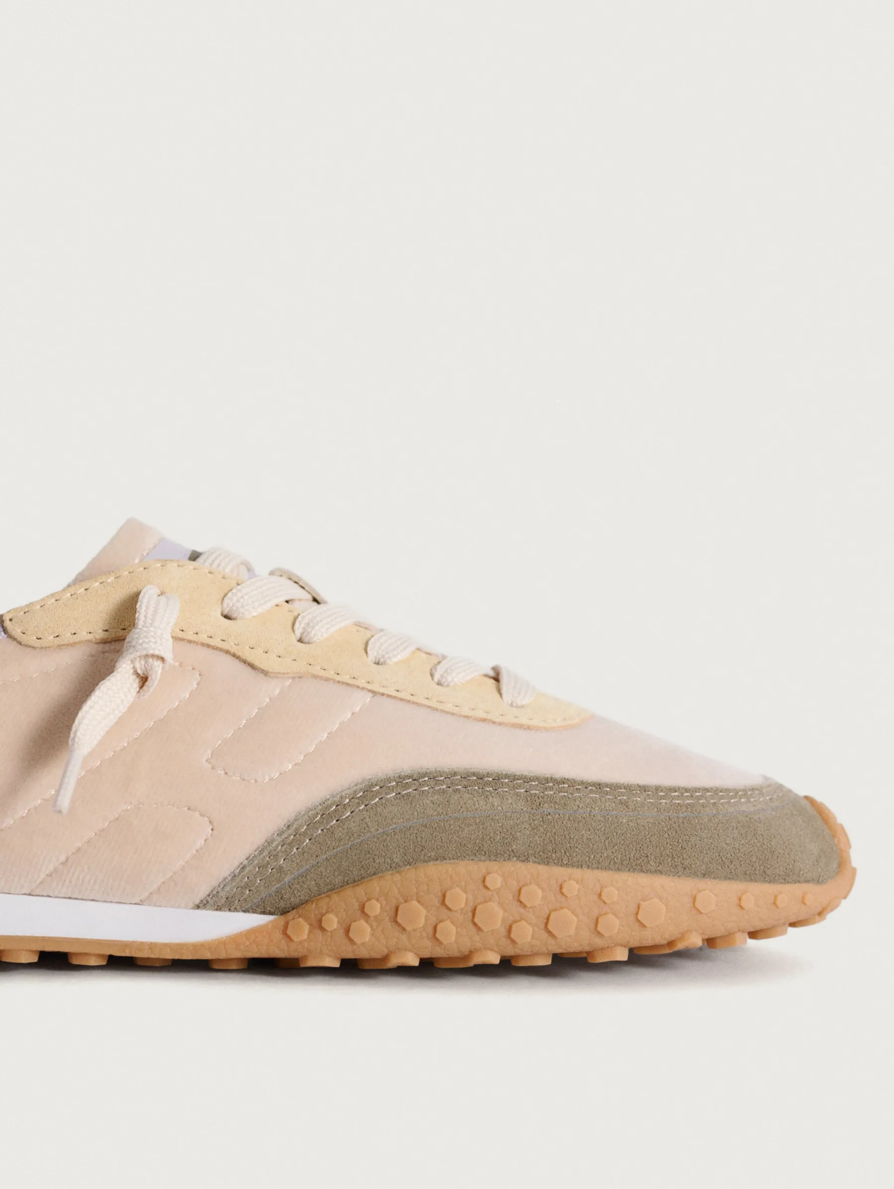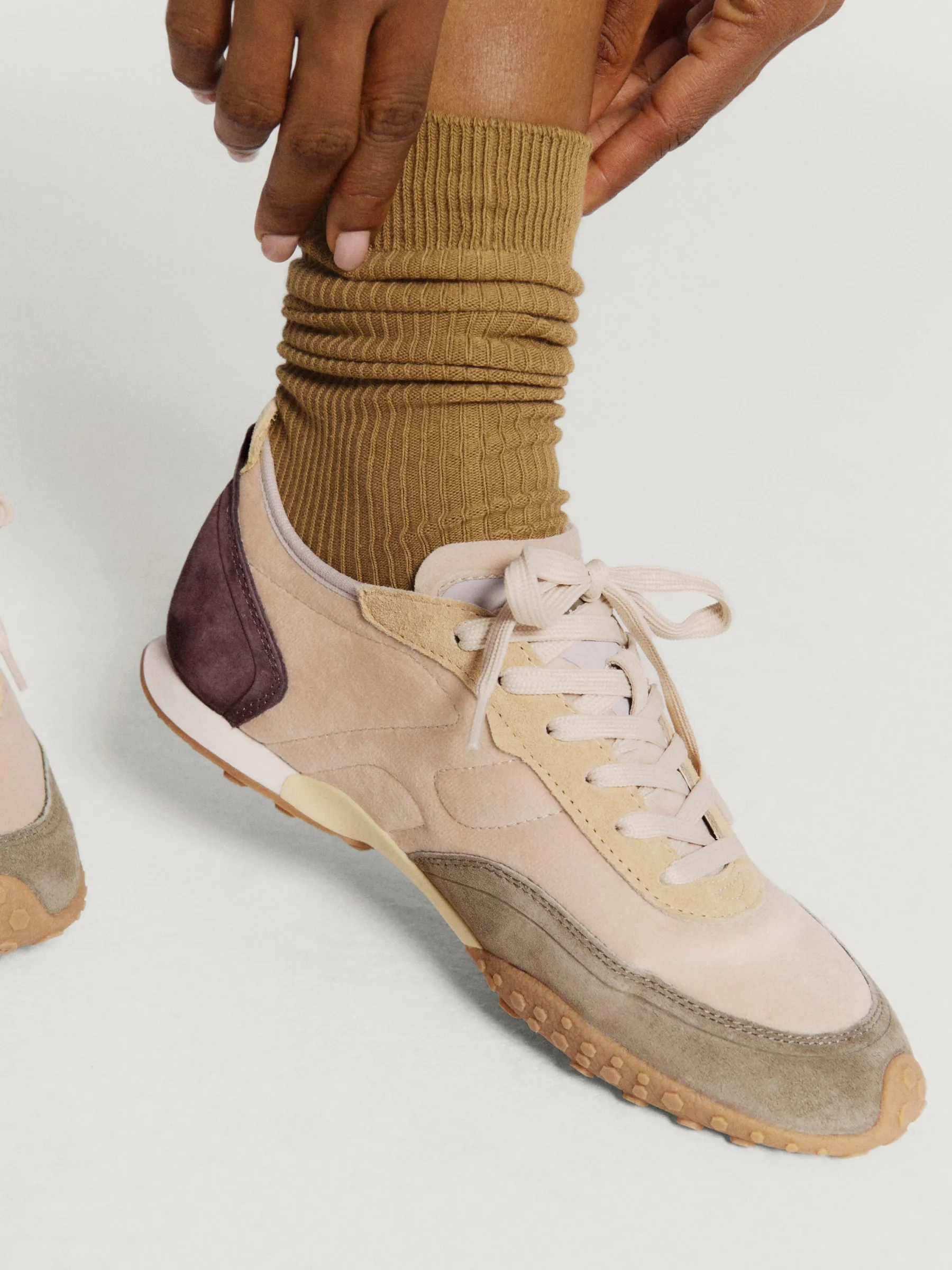 Die RAVEN Sneaker aus der BIRD Kollektion fangen die Essenz von Herbst und Frühling mit ihrem Design ein. Mit einer Ästhetik, die die klassische Sportform mit einem Hauch von Raffinesse verbindet, zeichnen sie sich durch ihre klaren Linien und das flache Profil aus. Ein ausgewogenes Verhältnis zwischen Leder und Stoff sorgt für besonderen Komfort. Die Farbtöne und Wildlederdetails werden durch die gelbe Gummisohle ergänzt, die subtile Anspielungen auf Fußballschuhe macht, jedoch mit einem modernen Touch. Ideal in Kombination mit einem Denim-Rock oder weiten Hosen.