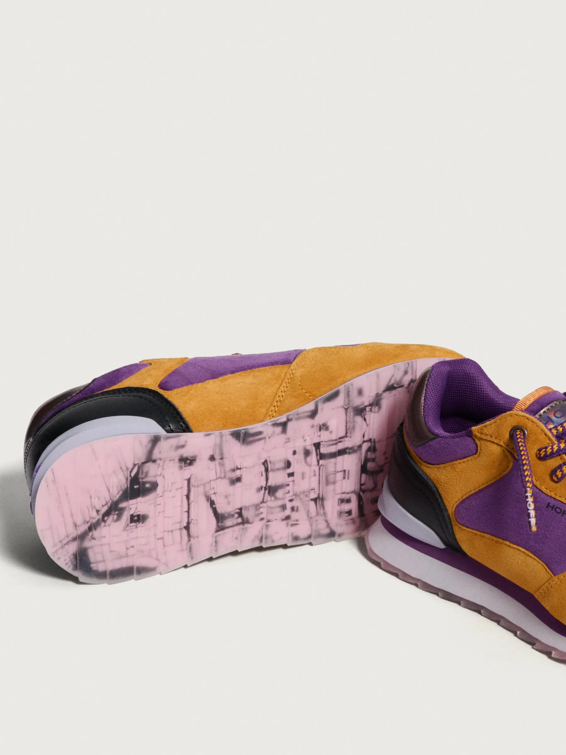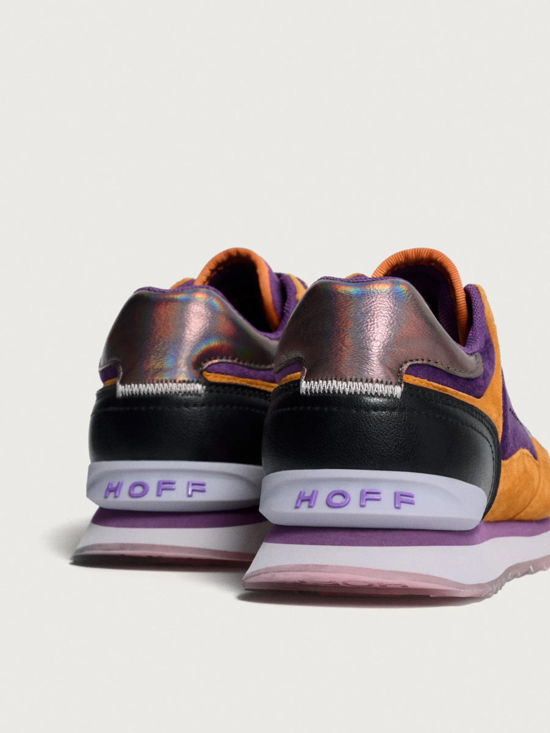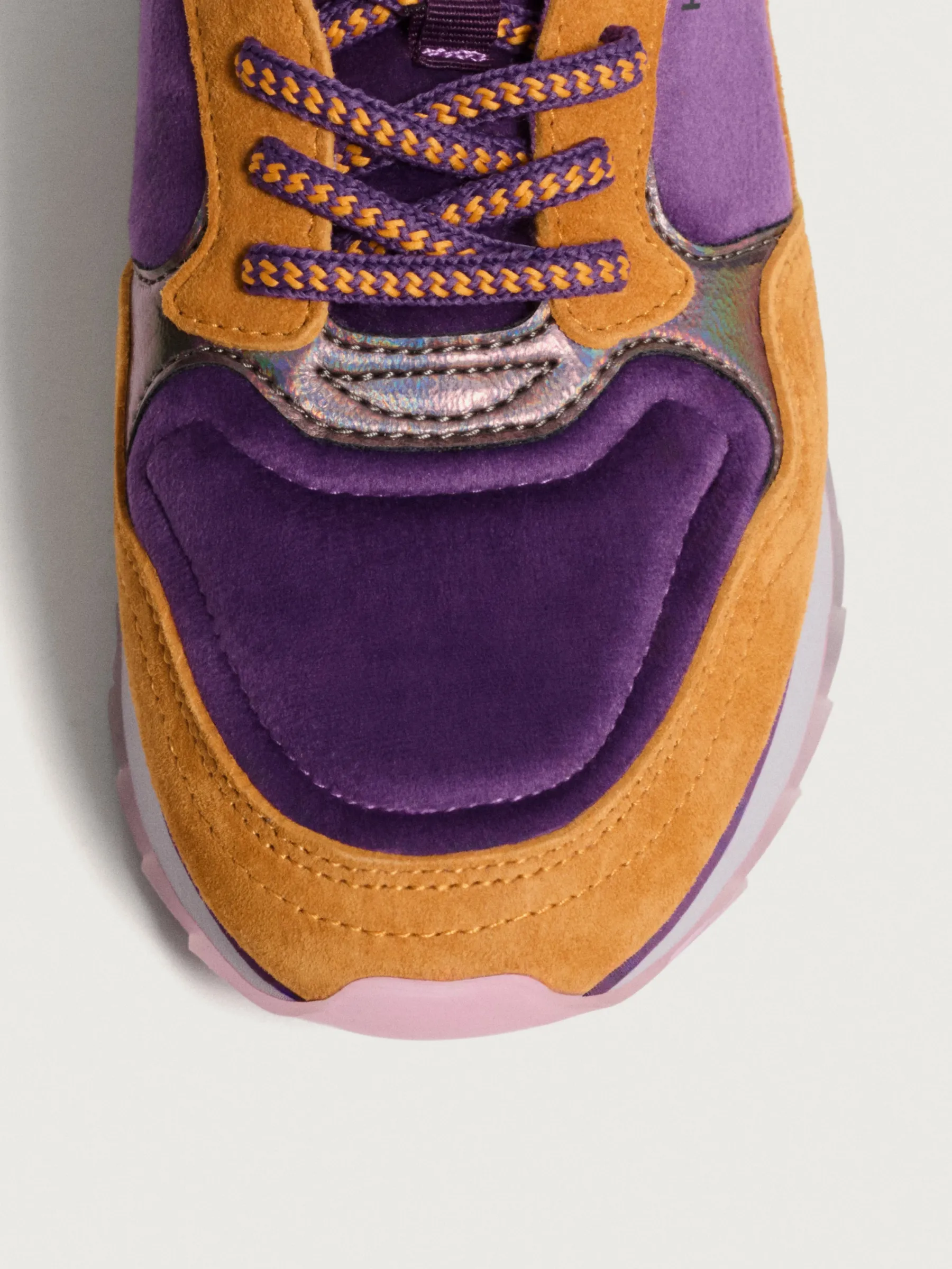 Einzigartigkeit und Originalität definieren die Modena-Sneaker. Mit einer Kombination aus Rauleder in Orange- und Violetttönen, einem irisierenden Fersenteil und passenden Schnürsenkeln zeichnen sich diese Schuhe durch ihren einzigartigen Stil aus. Die Mischung aus Materialien wie Leder und Samt bietet eine unverwechselbare und raffinierte Ästhetik. Trage sie mit einem violetten Midikleid und minimalistischen Accessoires in Orange, um die Details der Schuhe hervorzuheben.